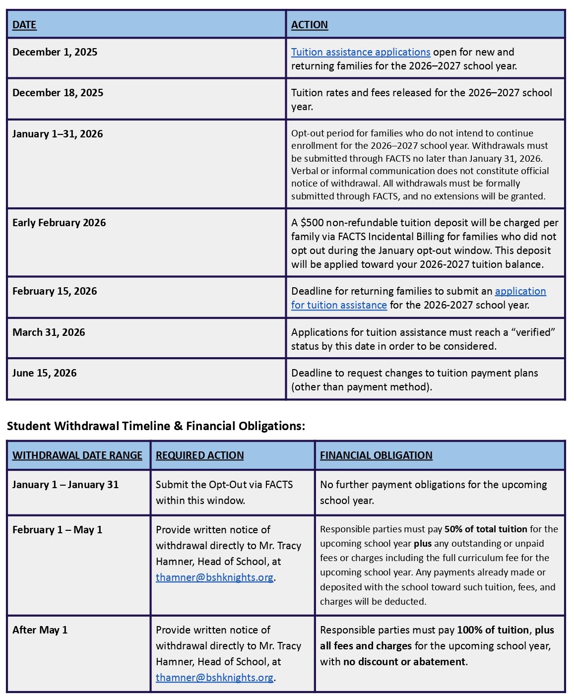 Families who do not intend to return for the upcoming school year must submit an official opt-out through FACTS during the designated January 1–31 opt-out window. Withdrawals submitted during this period release families from financial obligations for the following school year. Withdrawals after this window may result in partial or full tuition responsibility, depending on the timing.
